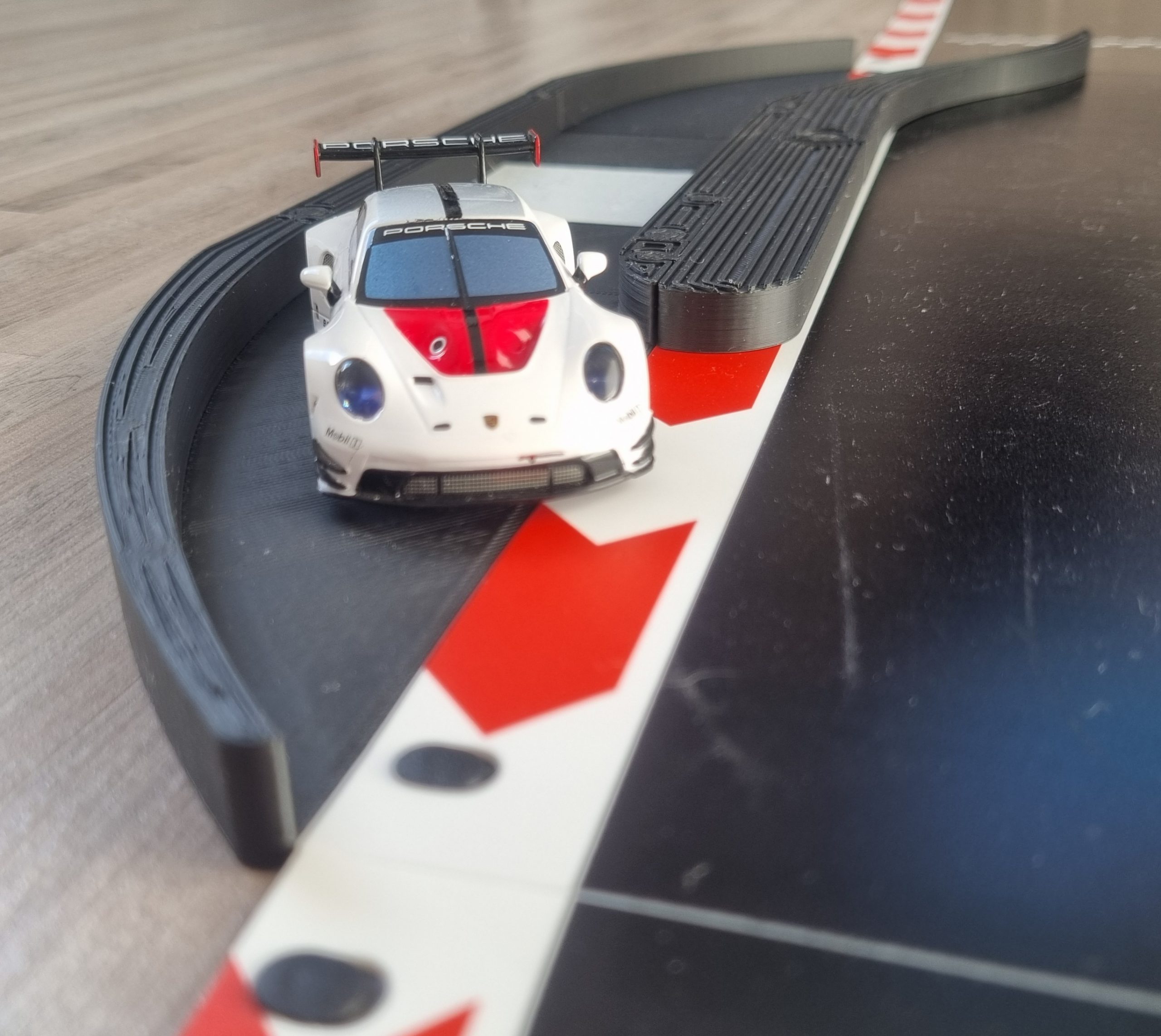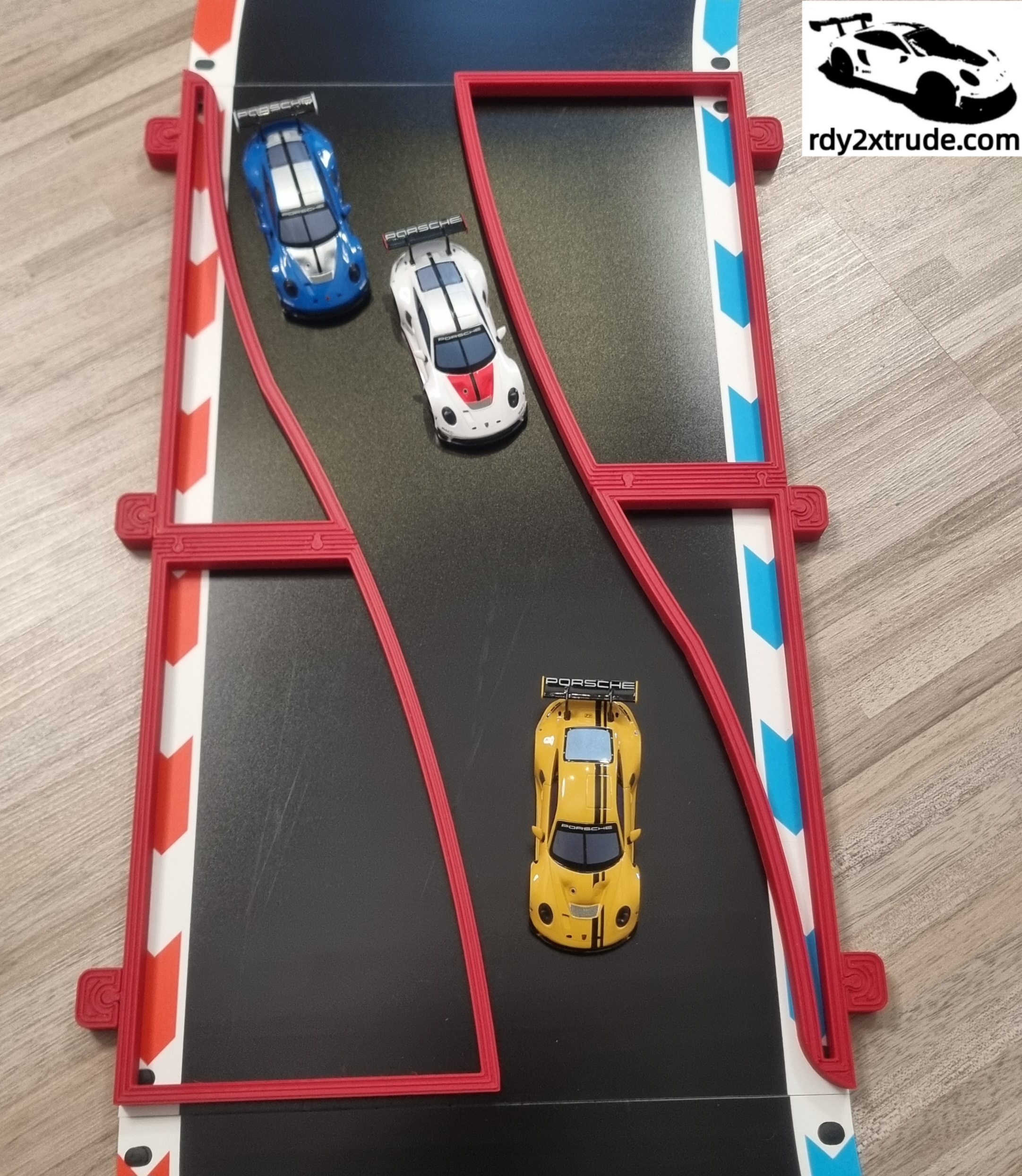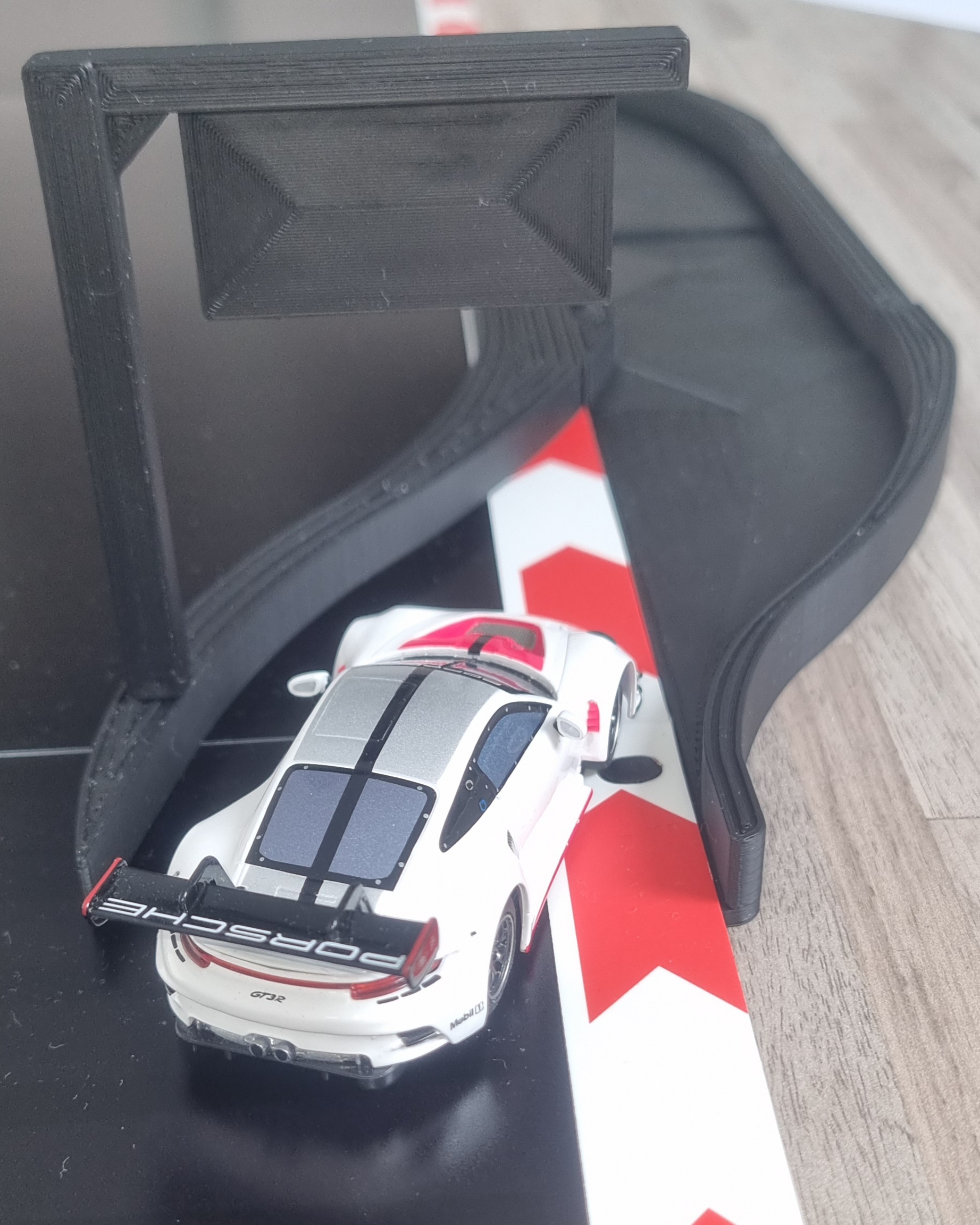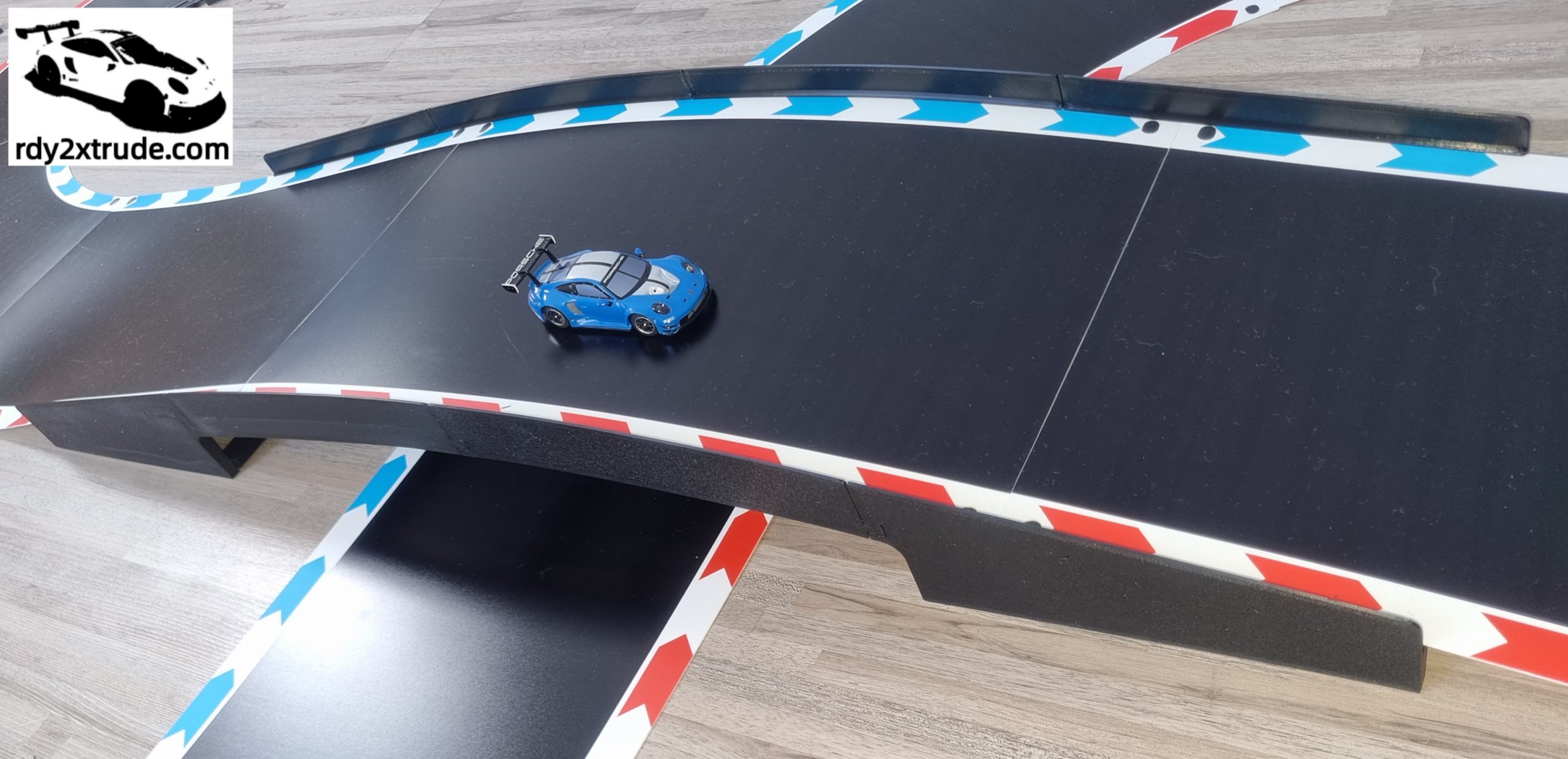 Boxengasse (THE FIRST ONE) mit Reifenreinigungsfunktion, die während des Rennbetriebs mit starker KI-Unterstützung durchfahren werden kann. Funktioniert natürlich auch mit schwacher oder geringer KI-Einstellung. Eine einfache, werkzeuglose Montage erfolgt über ein Stecksystem.