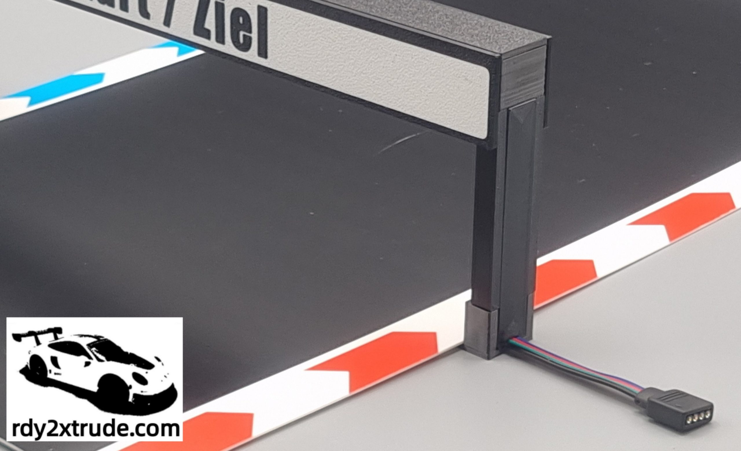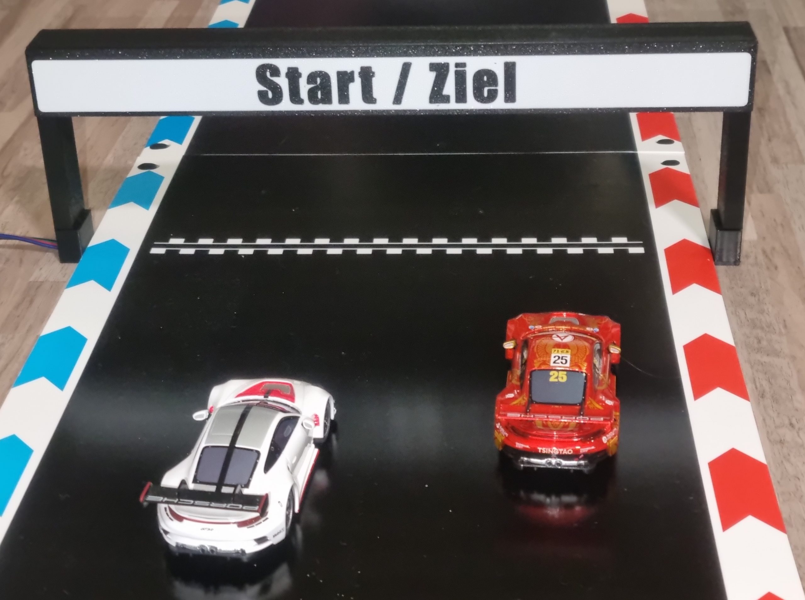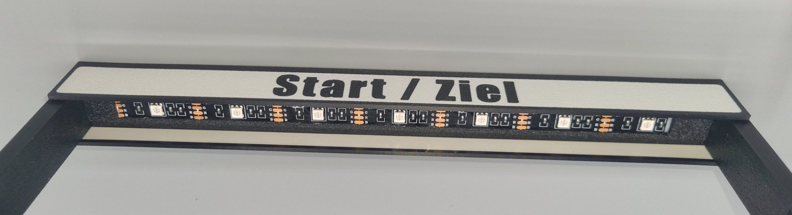 Alle Komponenten der Start-Ziel Brücke ohne Beleuchtung, jedoch komplett montiert inkl. montierter Beleuchtung und inkl. Bluetooth Controller (Android oder Apple App) mit USB Anschluss.